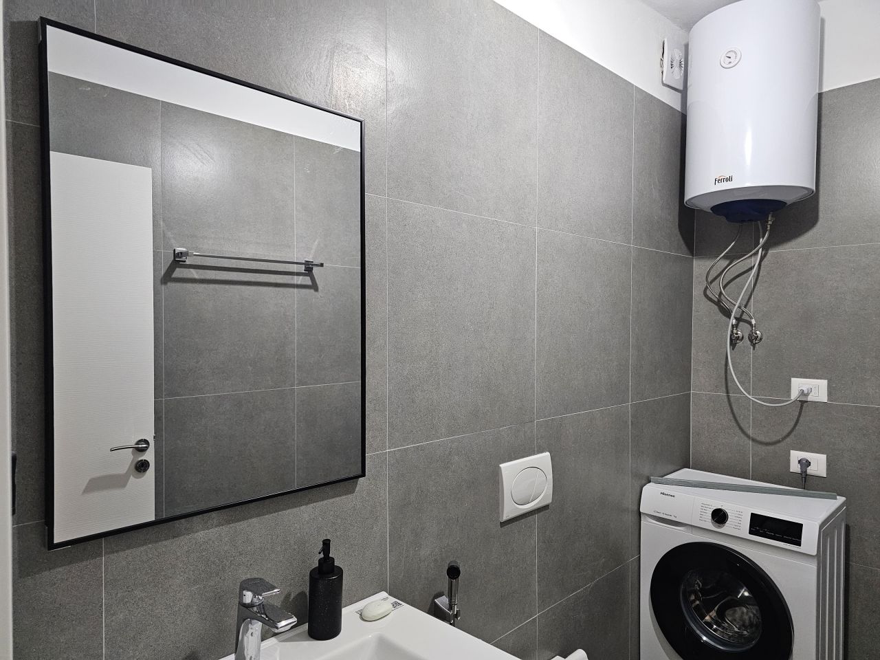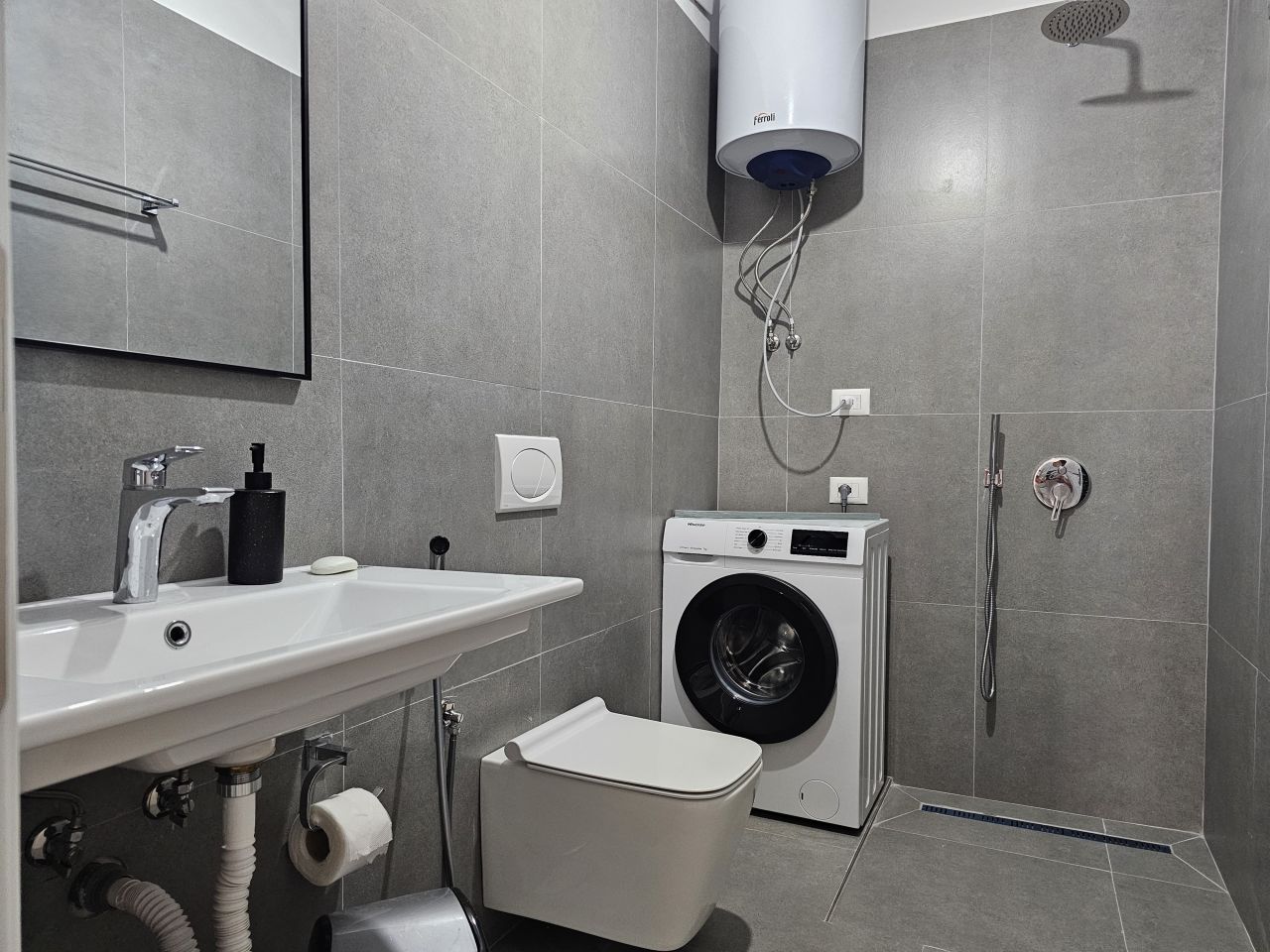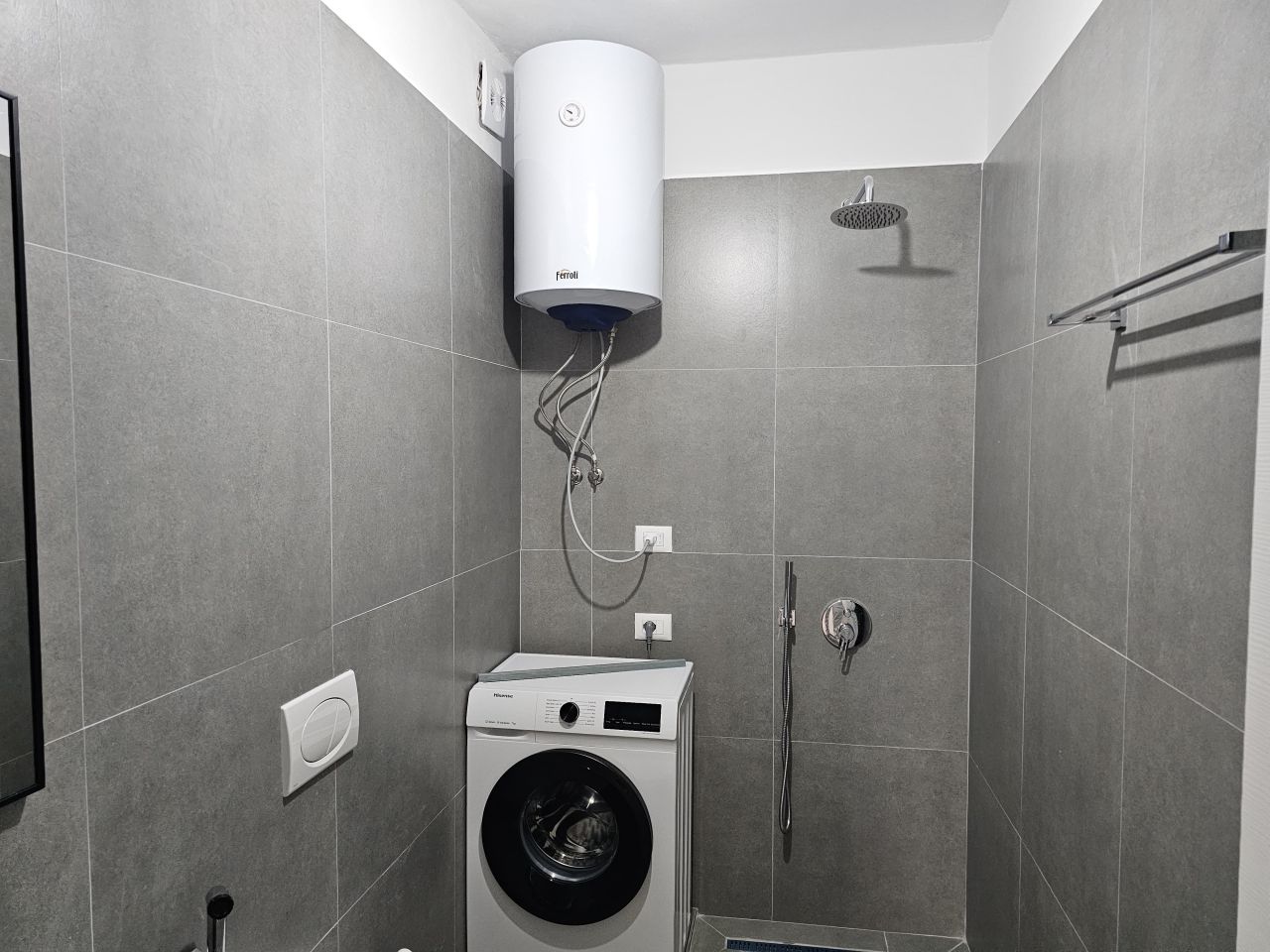 • One bathroom with shower cabn and washign machine