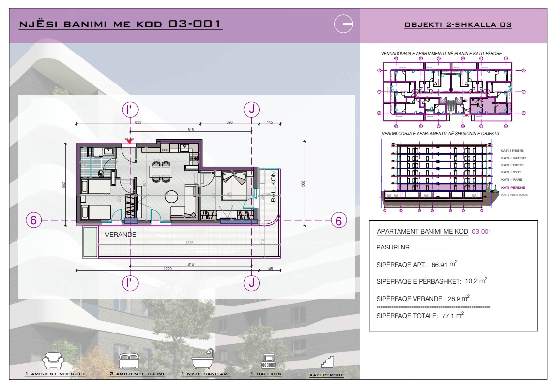 The apartment has a total surface of 77.1 m², thoughtfully designed to maximize functionality and comfort. The interior features a bright living room with kitchen area, two bedrooms, and one bathroom, making it an excellent choice for a holiday home, investment property, or year-round living.